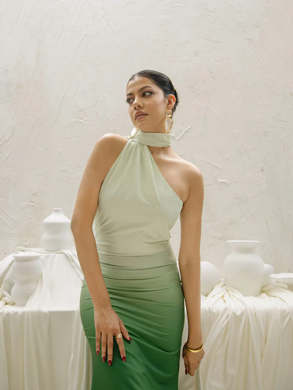 The Gaia Maxi Dress is elegance redefined. Made from luxe matte satin, it features a one-shoulder design with a stunning shawl detail that wraps around the neck. The dreamy green ombré adds a unique touch to its sleek silhouette. Perfect for special occasions, pair it with minimal heels for an effortlessly chic look.