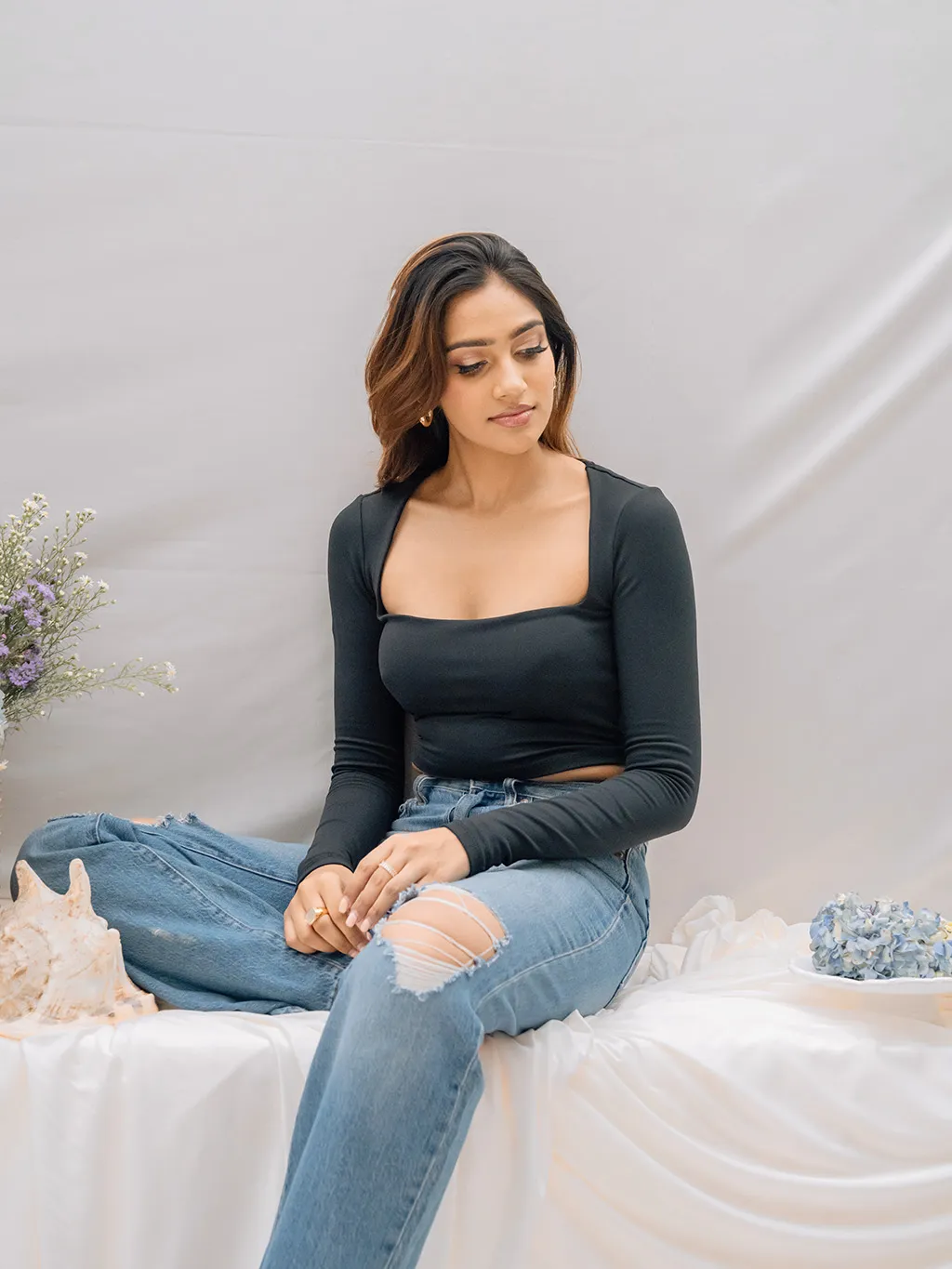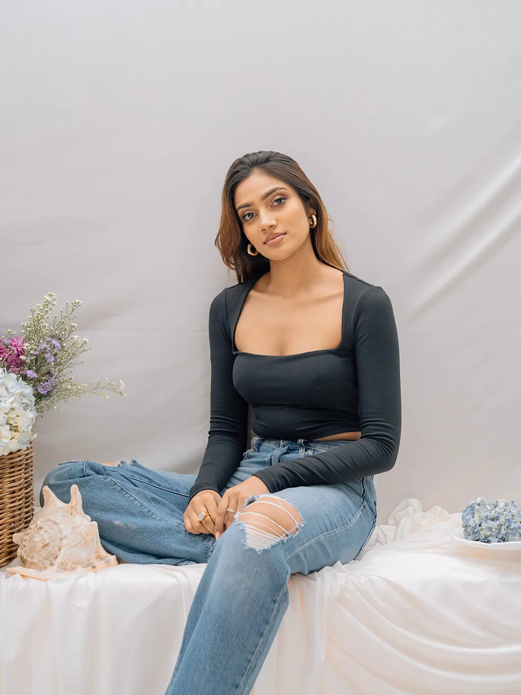A dreamy staple for your everyday rotation! The Hallie Top is a cropped style featuring a square neckline, full-length fitted sleeves, and a hint of stretch for a flattering, comfy fit. Perfect paired with high-waisted denim or a cute mini.